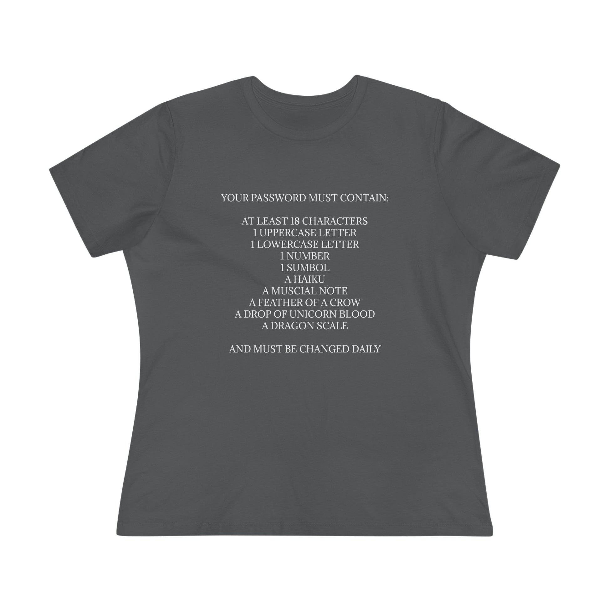 "Your Password Must Contain: At Least 18 Characters 1 Uppercase Letter 1 Lowercase Letter 1 Number 1 Symbol, A Haiku A Musical Note A Feather Of a Crow A Drop Of Unicorn Blood A Dragon Scale And Must Be Changed Daily" Security is a big thing but many websites and companies take passwords to the extreme.
